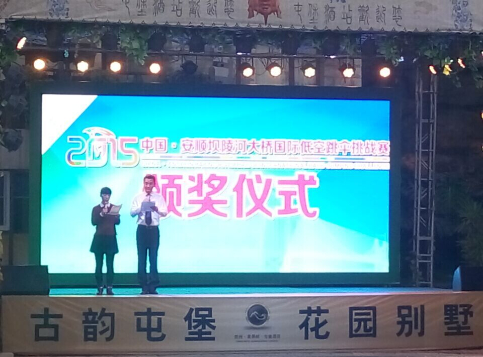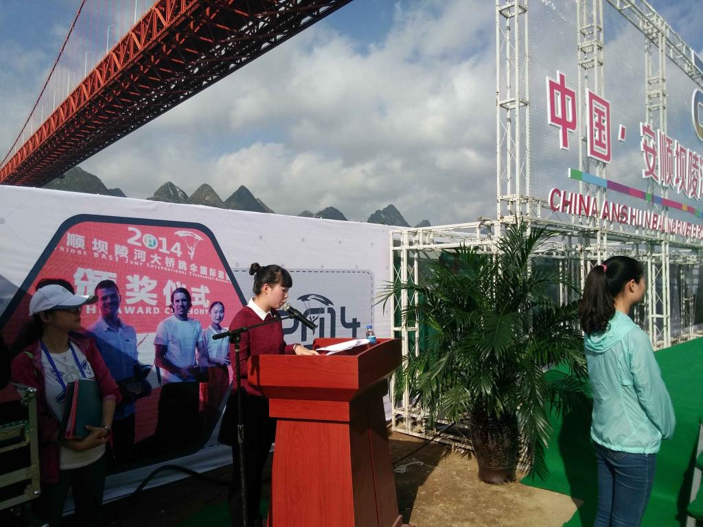 安顺学院杨傲霜(左一)为本次坝陵河跳伞挑战赛颁奖仪式做英文主持