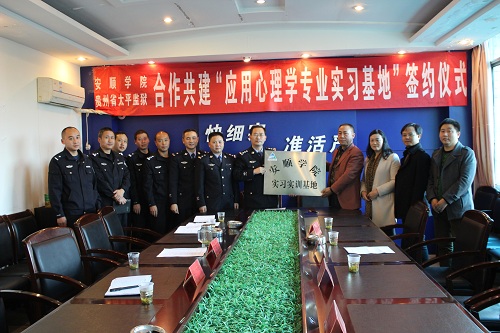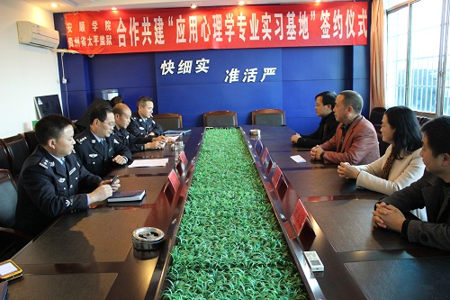 2015年11月12日下午,安顺学院与贵州省太平监狱举行了合作共建“应用心理学实习基地”签字和揭牌仪式。贵州省太平监狱党委委员、副书记、政委支振宇,副监狱长陈伟,各监区监区长,教育科学学院院长刘昌友、党总支书记师文慧、副院长邱天龙、教学科研与实践管理科科长班永飞参加签字仪式。仪式由太平监狱心理矫治中心主任赵亚主持。