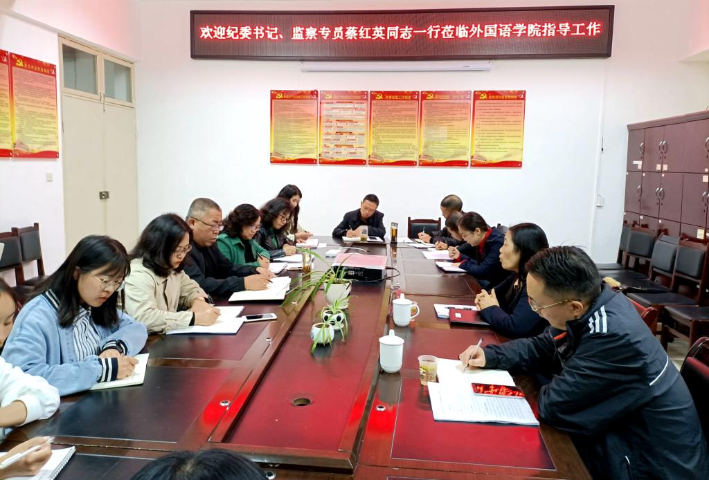 蔡红英对外国语学院、资环学院近期工作给予充分肯定,感谢大家对学校纪检监察工作的支持和理解。在调研座谈会上,蔡红英分别听取了外国语学院和资环学院班子关于党内政治生态分析研判工作、教职工“双节”期间廉洁自律情况和二级党委纪检委员作用发挥的汇报,并与师生围绕党内政治生态分析研判中“九看”重点内容、面临的困难和问题进行交流座谈。