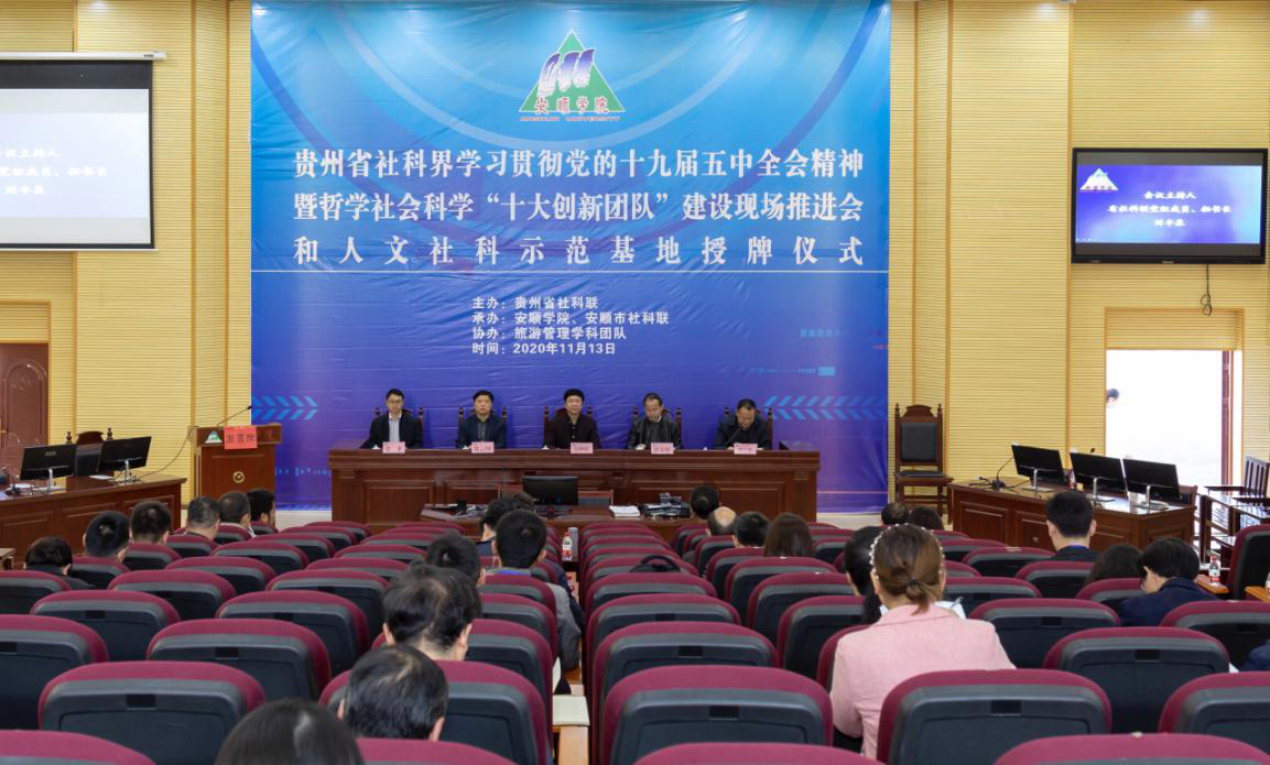 2020年11月13日下午,贵州省社科界学习贯彻党的十九届五中全会精神暨哲学社会科学“十大创新团队”建设现场推进会在安顺学院模拟法庭召开。省社科联党组书记、副主席包御琨,安顺学院党委书记罗荣彬、校长陈云坤、副校长张来,省社科联党组成员、秘书长刘丰泉,安顺市社科联党组书记高守应出席会议。全省市州社科联、2016至2019年40个哲学社会科学“十大创新团队”,2020年10个人文社科示范基地相关负责人参加会议。刘丰泉主持会议。