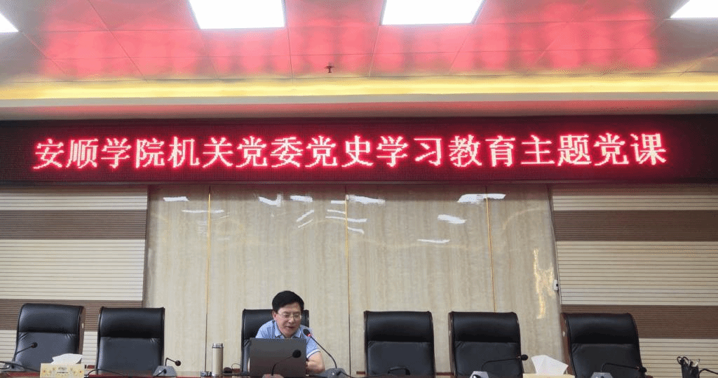 6月25日下午,安顺学院机关党委党史学习教育专题党课在特教大楼7楼会议室举行,机关各党支部近100党员听讲。