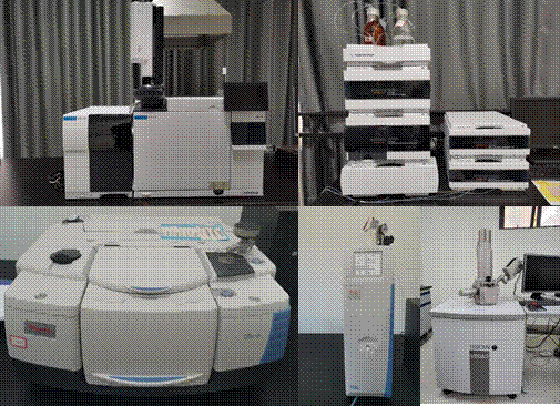 中心分析测试仪器有:气相色谱-质谱联用仪(Agilent 8890 GC system)(5977B GC/MSD)、原子吸收光谱仪(Thermo ICE 3000 SERIES)、扫描电子显微镜(TESCAN VEGA3)、液相色谱仪(Thermo UltiMate 3000)、离子色谱仪(Thermo scientific Aquion IC)、傅里叶红外变换光谱仪(Thermo scientific iS50 FT-IR)等大型仪器。