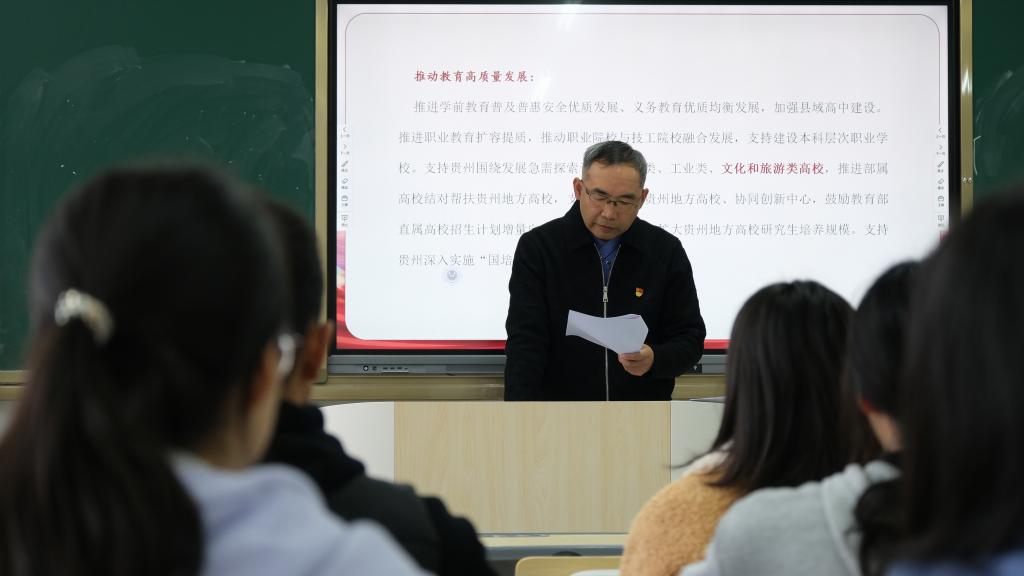 会议指出,国发〔2022〕2号文件再次聚焦贵州,支持贵州在新时代西部大开发上闯新路,充分体现了党中央、国务院对贵州的特殊关怀、特殊厚爱,对贵州未来发展具有十分重大而深远的意义;作为新时代大学生,要抢抓机遇,在专业学习时,要注重将文化与旅游充分结合,进行深度学习。