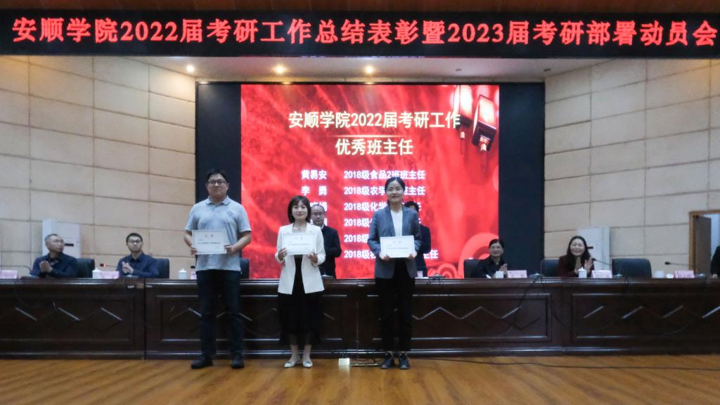 2022年5月26日上午,安顺学院2022届考研工作总结表彰暨2023届考研部署动员会在学术报告厅举行。安顺学院党委书记罗荣彬、校长陈云坤,党委副书记陶文彩,副校长郭本华、韦英、张来、殷红敏,党委委员何朝越、杜志明出席会议。各二级学院副处级以上干部、各职能部门负责人、2018级和2019级全体班主任、2018级拟录取的研究生代表、各学院2019级考研学生代表参加会议。安顺学院副校长张来主持会议。