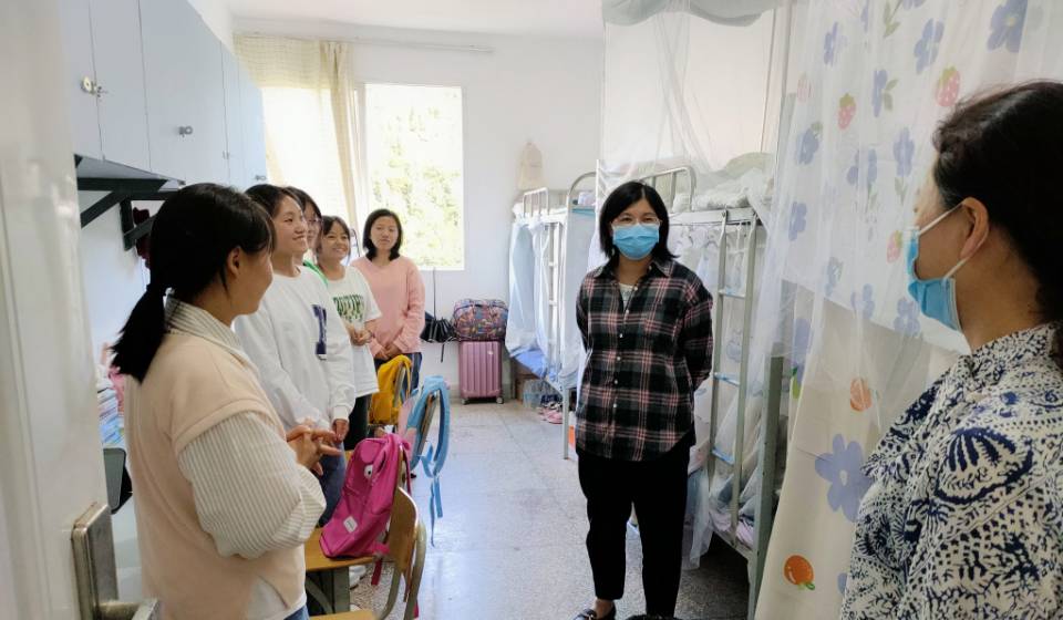 安顺学院副校长韦英(右二)在新生宿舍开展疫情防控政策宣讲