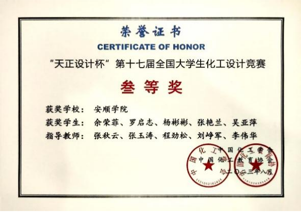 近日,全国大学生化工设计竞赛委员会传来喜讯,安顺学院2支代表队获得国家二等奖1项、国家三等奖1项,西南赛区一等奖1项、赛区二等奖1项的优异成绩。