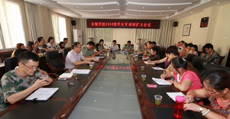 为确保新生拉练射击工作安全顺利完成,9月15日下午,我校2014级学生军训团扩大会议在办公楼二楼会议室召开。军训团政委、学校党委副书记陶文彩,军训团团长、学校副校长王芳恒,以及其他军训团团部干部、各学院党总支书记和新生班主任等参加了会议。会议由王芳恒团长主持。