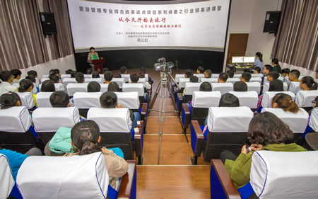 10月11日上午,黄果树旅游集团股份有限公司总经理、旅游学院兼职教授周云虹女士应邀在A02教室举行“大学生怎样做好职业规划”讲座,旅游学院2014级旅游管理班及文化产业管理班全体同学120余人聆听了讲座,讲座由旅游学院党总支书记胡赤兵主持。
