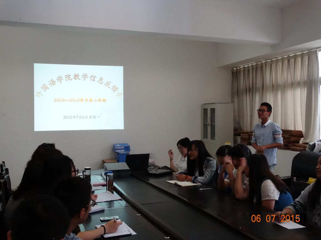 2015年7月6日上午,外国语学院在新教学楼七楼会议室召开学院教学信息反馈会。外国语学院院长蒋燕,分管英语专业日常教学的副院长曾沉,分管日语专业日常教学的副院长刘碧芬,英、日语专业教研室主任、教师代表、学院各年级学生代表参加了反馈会。反馈会由曾沉副院长主持。