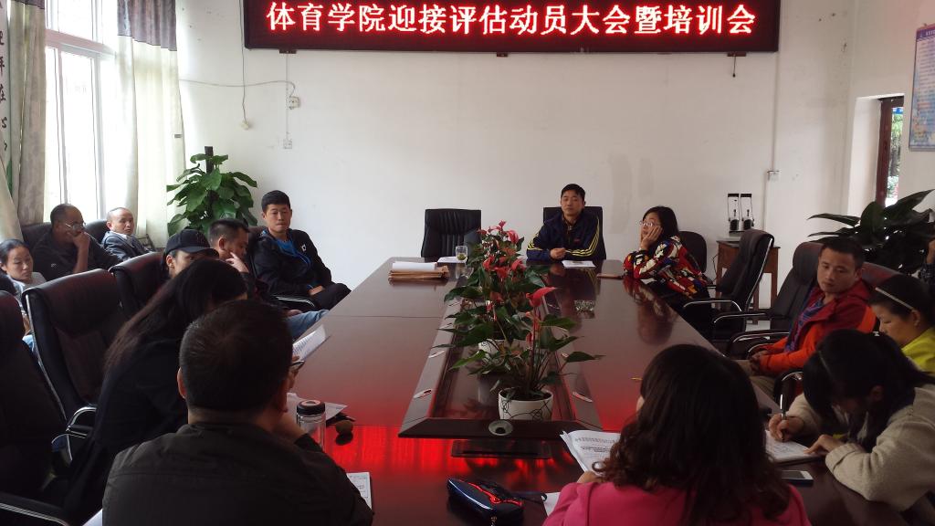 为迎接本科教学工作合格评估,体育学院于2015年10月12日下午召开体育学院迎接评估动员大会暨培训会,体育学院党政领导、全体教师参加了本次会议,会议由体育学院院长邓文红教授主持。