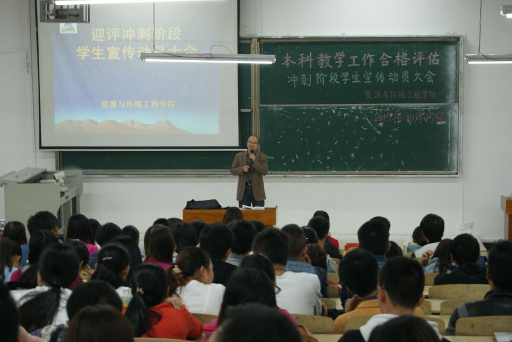 为迎接安顺学院本科教学工作合格评估,2015年10月15日晚,资源与环境工程学院在新教学楼A12教室召开本科教学工作合格评估冲刺阶段学生宣传动员会,资环学院党总支书记张声俊、院长冯开禹教授、团总支书记宋艳及资环学院全体学生参加。会议由辅导员张炜亮老师主持。