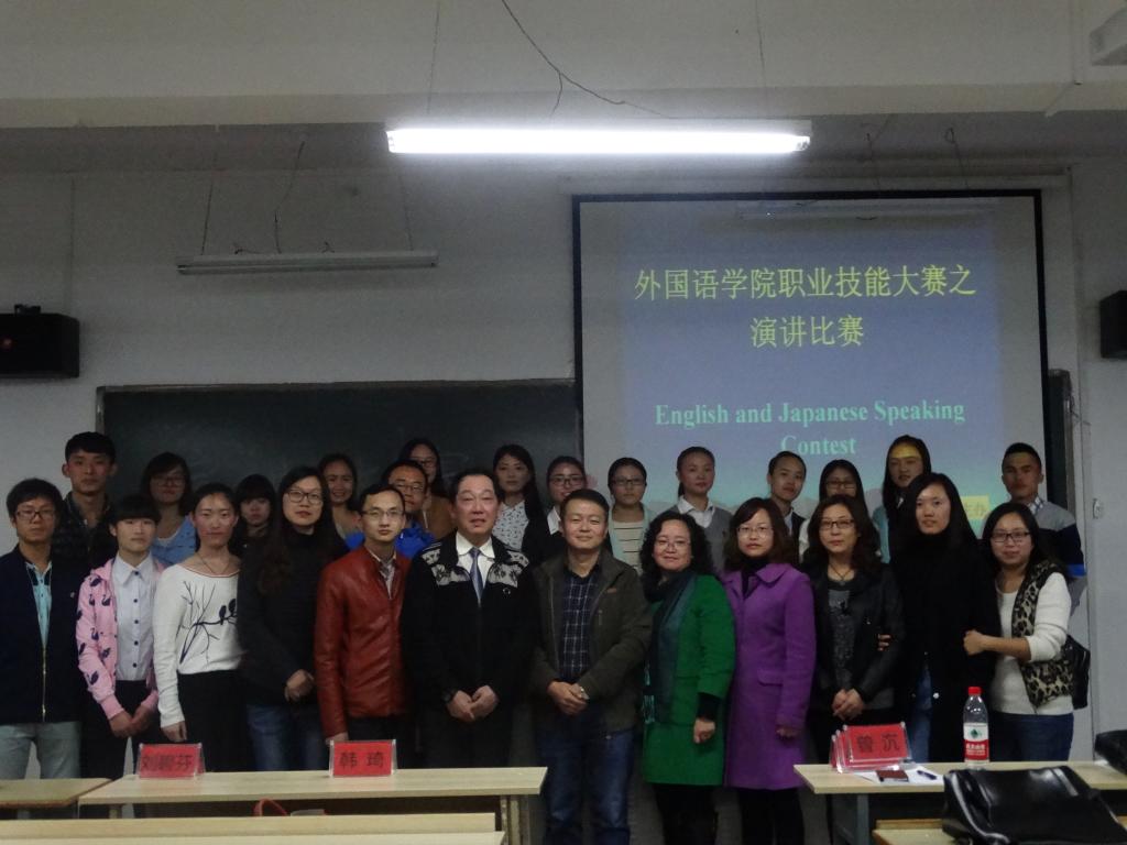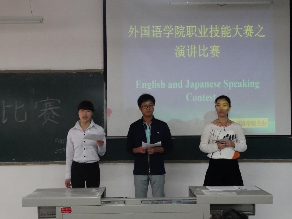 2015年11月16日下午,外国语学院在新教学楼0B33举行职业技能大赛之演讲比赛。外国语学院院长蒋燕、党总支书记虞均杰,英语专业副院长曾沉老师、日语专业副院长刘碧芬,日语教研室主任韩琦老师、日语外教大津夏生老师以及王旭老师、高小妹老师担任评委。