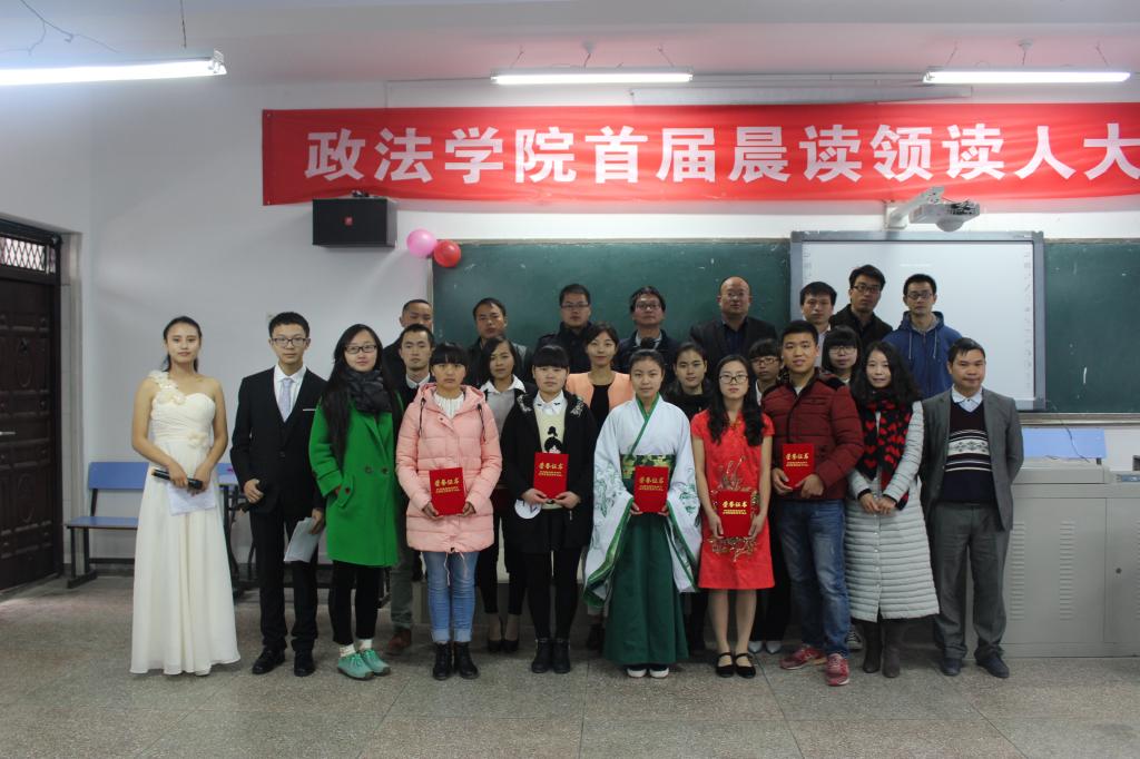 2015年11月28日上午,为进一步加强学风建设,弘扬社会主义核心价值观,营造政法学院良好积极的晨读氛围,提升同学们的阅读和朗诵能力,引领同学积极诵读中华优秀经典书籍和作品,展示同学的精神风貌和激发同学的青春与活力,政法学院在新教学楼B21教室举办了首届“晨读领读人”比赛。政法学院党总支书记、院长徐忠,副院长余治平,瞿家儒、彭建斌等教师以及各班大众评委担任比赛评委。