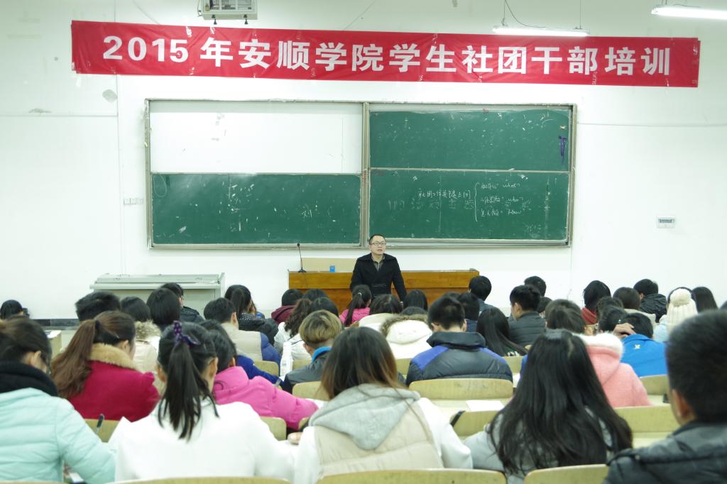 12月2日下午,安顺学院2015年学生社团干部培训开班典礼在新教楼A11教室举行。校团委书记杨文波、副书记崔晓莉,团委老师胡蕾、吴胜艳、周瑞祥及各学生社团干部参加开班典礼。典礼由吴胜艳老师主持。