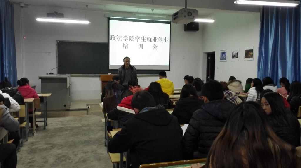 2015年12月9日下午,政法学院在新教学楼0812教室举办大学生就业创业培训会。政法学院50余名同学参加此次培训,政法学院教师罗宪志主讲。