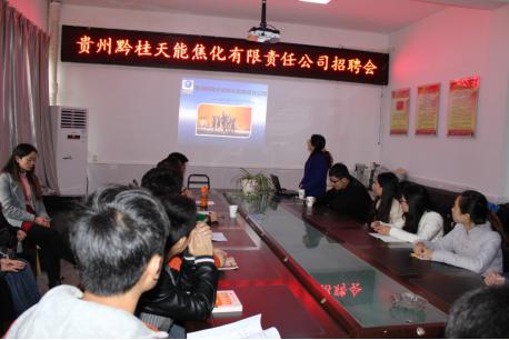 3月24日下午,贵州黔桂天能焦化有限责任公司专场招聘会在化学化工学院会议室举行,化学化工学院党总支书记杨莉莉、学生科科长柯杨、辅导员以及2012级毕业班、2013级化学工程与工艺专业学生参加本次招聘会。