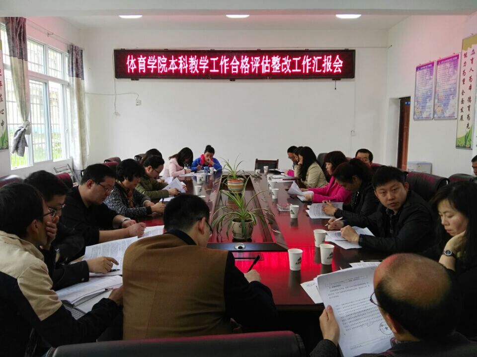2016年4月7日上午,由评建办、教务处、学生处等部门组成的学校督导检查组到体育学院开展本科教学工作合格评估整改工作检查,体育学院党总支书记孙黔,院长邓文红,副院长刘宁、林金茹,科级以上干部,教研室主任及全体坐班老师参加本次整改工作汇报会。会议由教务处副处长王罡主持。