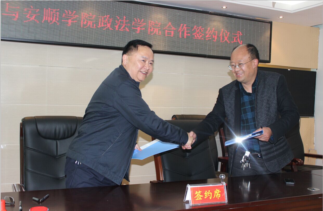 2016年4月8日下午,安顺学院政法学院党总支书记、院长徐忠和教师张洪智、郭明、杨立新、邓肄、肖仕刚、潘继材、岑英武一行八人,到关岭自治县人民检察院就联合培养人才、参与检察院案件评查等方面工作开展合作签署协议。