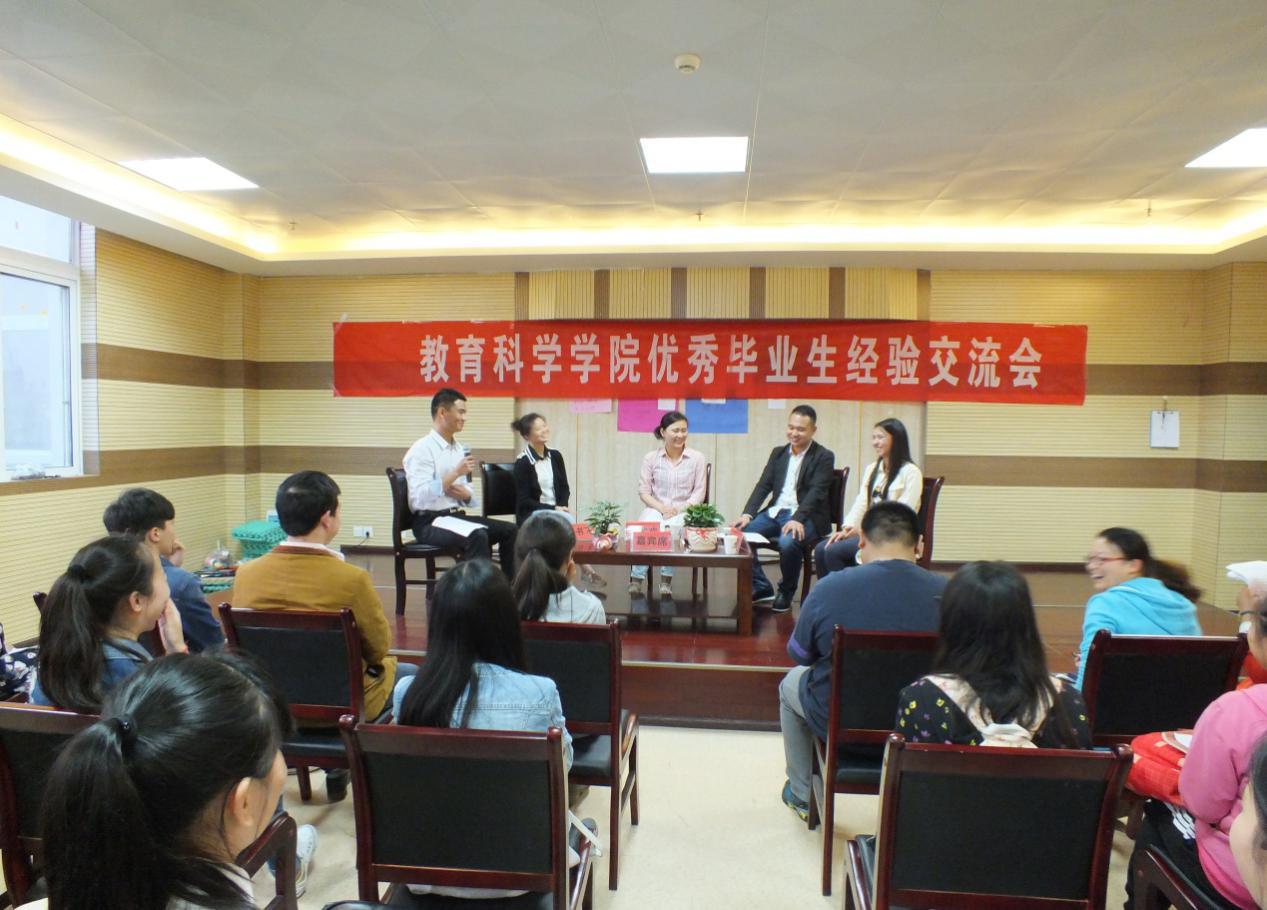 2016年4月14日,教育科学学院在特教大楼7楼的团体辅导室开展了教育科学学院创业就业活动月系列活动之优秀毕业生经验交流会。此次交流会邀请的嘉宾是教育科院学院2012届优秀毕业生耿光辉,2014届优秀毕业生汪凤维、袁书飞和2015届优秀毕业生张黎欢四位同学。
