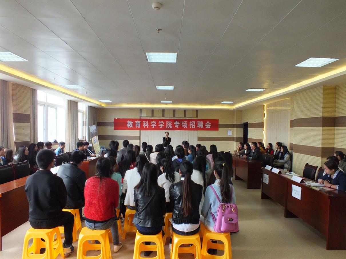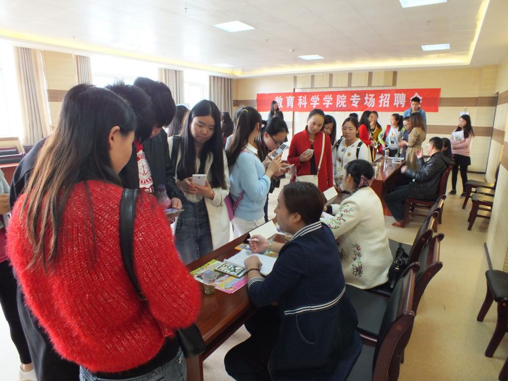2016年4月26日,教育科学学院于特教大楼七楼举办了2016届毕业生专场招聘会。本场招聘会主要邀请了普定同心幼儿园、镇宁东方宝贝幼儿园、安顺开发区优优教育中心、安顺开发区金贝尔幼儿园以及安顺开发区爱心妈妈幼儿园五所幼儿园。我院2016届学前教育专业毕业班以及大二、大三的学前教育专业的同学参加了招聘会。
