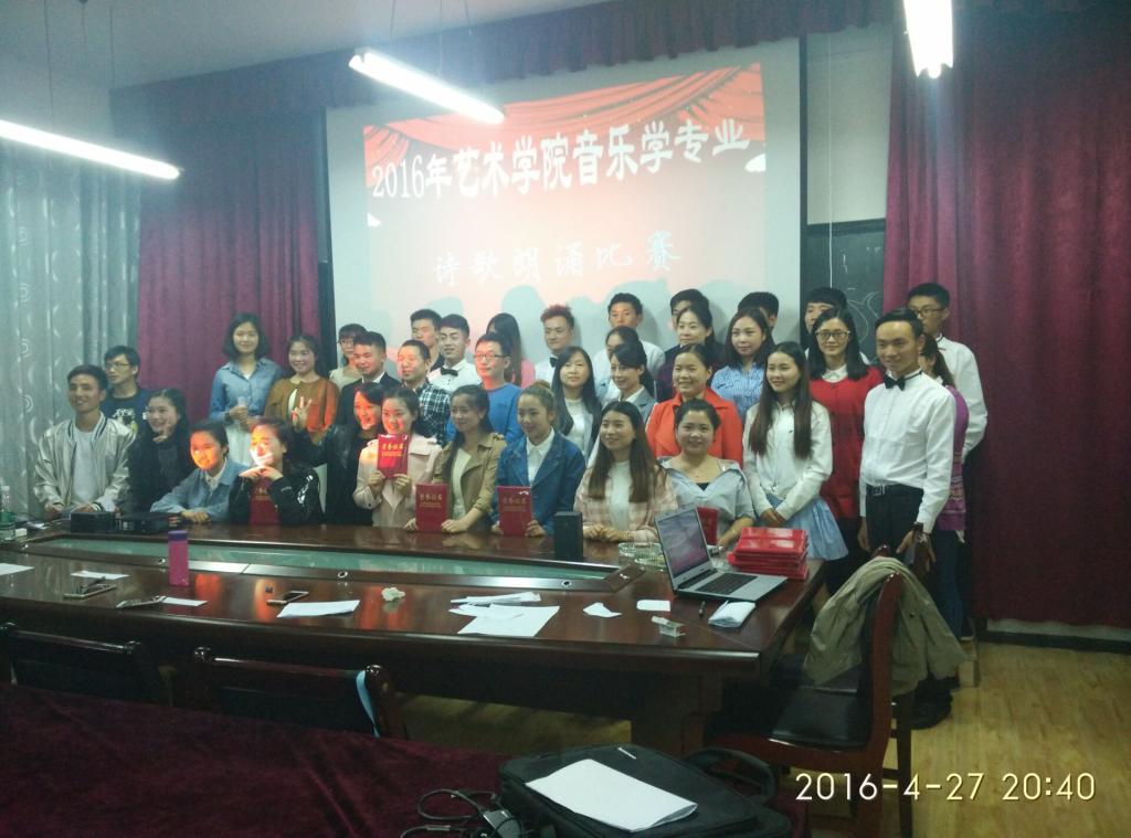 4月27日晚,安顺学院艺术学院在艺术楼二楼会议室举办以“歌唱青春、礼赞音乐”为主题的诗歌朗诵比赛。艺术学院副院长何谦、副教授杨双红、教务科科长付善莉,体育学院教务科科长刘建国,艺术学院老师廖猜猜、王钧担任评委。艺术学院13、14、15级音乐学专业的学生参加此次比赛。比赛由孟米月、赵涛同学主持。