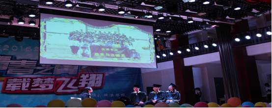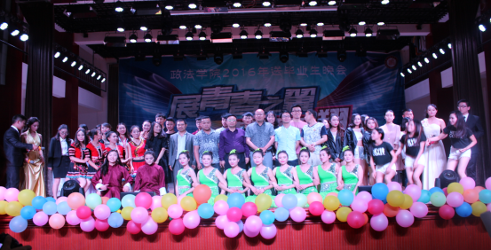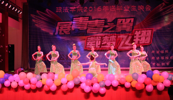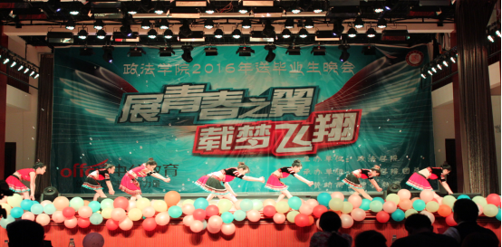 2016年5月11日晚,政法学院在学校大礼堂举办以“展青春之翼,载梦飞翔”为主题的2016届毕业生欢送晚会。政法学院全体师生及其他学院师生共500余人观看晚会。