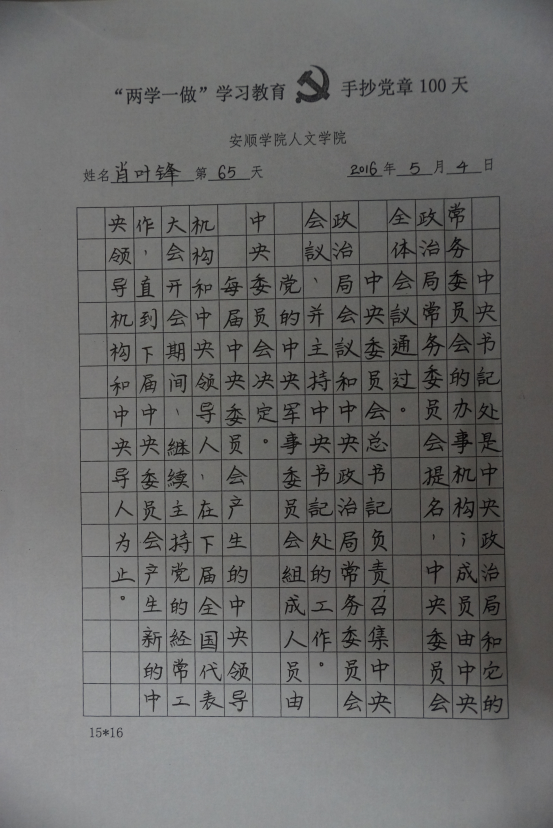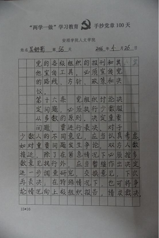 为了更好地践行“两学一做”系列讲话精神,应安顺市委组织部下发关于“手抄党章100天”通知的要求,人文学院学生党支部积极响应市委组织部号召,于4月15日起组织13、14级学生党员积极参与活动。
