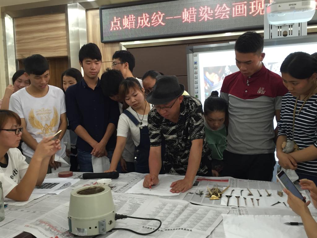 2016年6月13日下午,由安顺学院博物馆主办的“点蜡成纹-----蜡染现场绘画体验活动”在华荣图书馆三楼多功能报告厅举行。此次活动的嘉宾为“中国民族工艺美术大师”徐波,来自不同学院的师生们在徐老师的指导下现场进行蜡染创作,亲身体验传统民族工艺的非凡魅力。