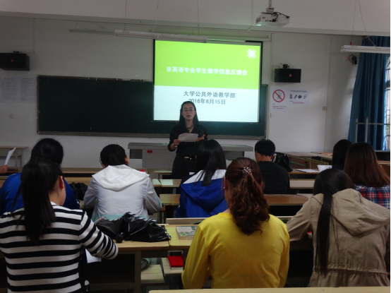 6月15日下午,大学公共外语教学部召开了非英语专业学生的教学信息反馈会。大学公共外语教学部主任、外国语学院院长蒋燕教授、大学英语教研室主任白延平等大学英语教师,学生代表30余人参加了此次教学信息反馈会。大外部王慧颖副主任主持教学信息反馈会。