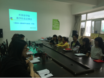 2016年6月15日,2015—2016学年度第二学期教学信息反馈会在外国语学院会议室召开。外国语学院院长蒋燕教授、外国语学院书记虞俊杰副教授、外国语学院副院长曾沉副教授、刘碧芬副教授以及英、日语教师代表及学生代表参加了反馈会。日语教研室主任韩琦老师主持会议。