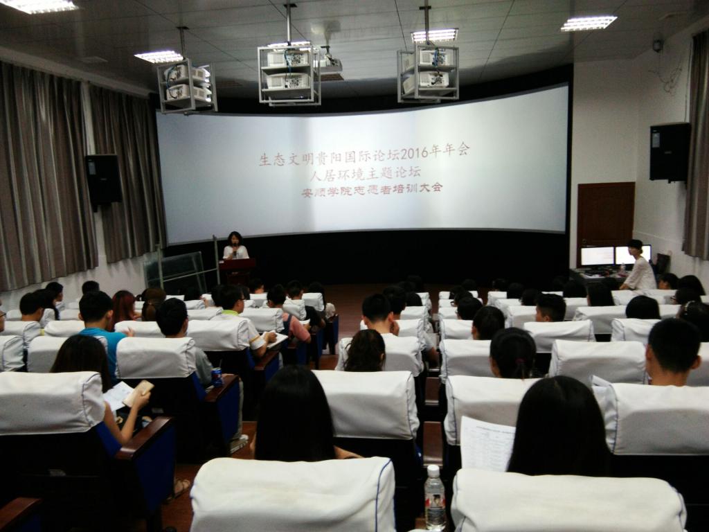 2016年7月4日,生态文明贵阳国际论坛2016年年会人居环境主题论坛志愿者培训大会在安顺学院举行。共青团安顺学院委员会杨文波书记,共青团安顺市委学少部王青青副部长及黄果树生态论坛接待组郭聃同志出席此次培训会,安顺学院55名师生志愿者及组委会接待组25名接待服务人员参加此次培训。会议由安顺学院团委社会实践部周瑞祥老师主持。