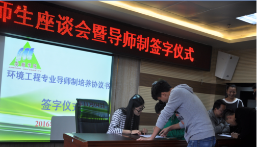 2016年11月4日,安顺学院环境工程专业导师与2014级环境工程班全体同学正式签约,标志着环境工程专业导师制培养正式进入实施阶段。资环学院院长冯开禹教授,党总支书记张声俊教授,副院长李仕蓉教授、王家录副教授以及环境工程专业全体导师出席签字仪式。仪式由环境工程教研室主任王恩文副教授主持。