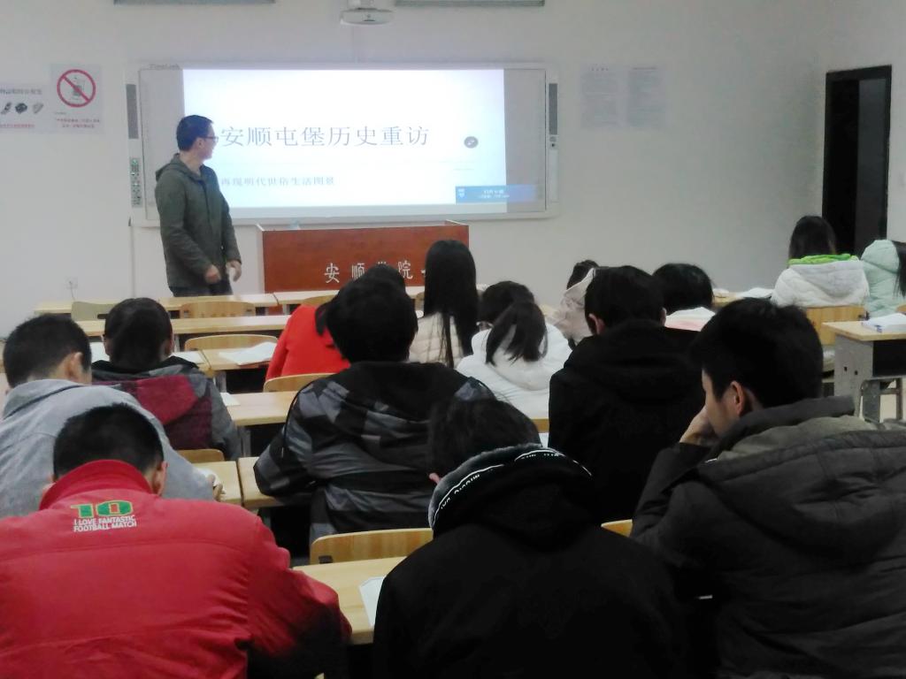 根据中共安顺市委宣传部文件关于印发《2016年“宣传部长上讲堂”活动方案》的通知(安宣通[2016]15号)“市委宣传部、市直宣传思想文化系统各单位领导班子成员及中层干部平均每季度在道德讲堂宣讲不少于2次,全年不少于8次”的文件要求,宣传部人员深入班级开展道德宣讲。9月27日,安顺学院“安顺屯堡历史重访——再现明代世俗生活图景”专题宣讲在特B0804举行。安顺学院宣传部宣传科王智勇副教授主讲,资环学院学生聆听宣讲。