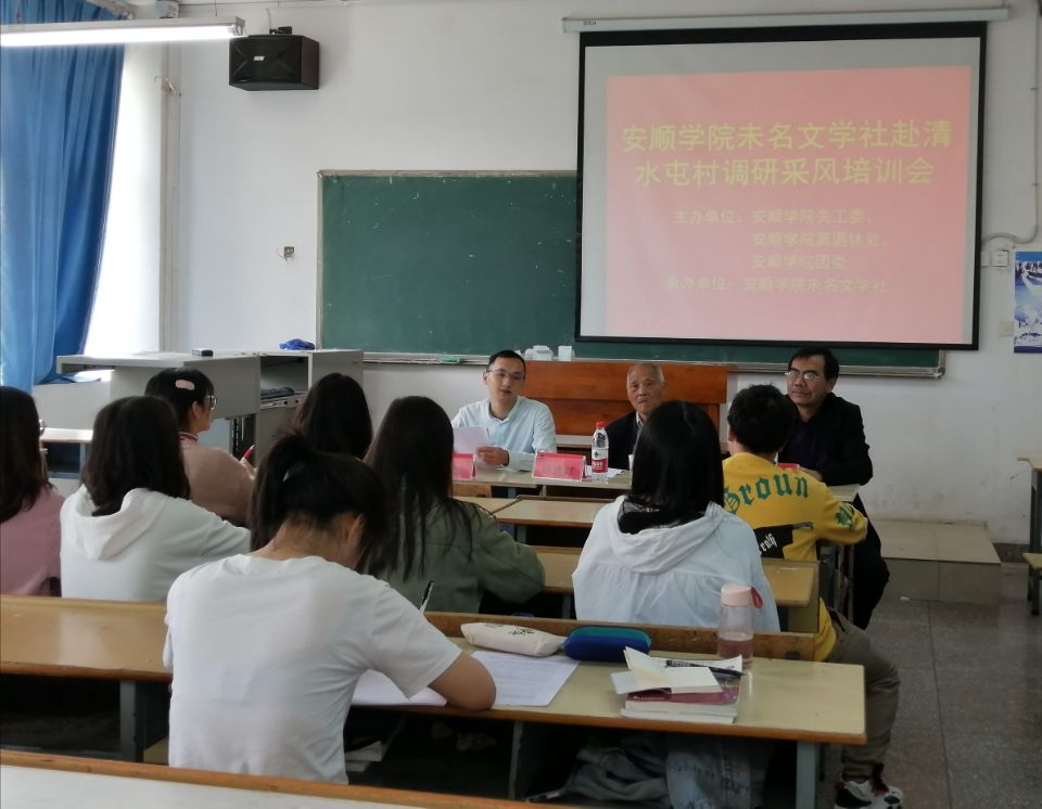 4月22日,校关工委、离退休干部工作处、校团委在安顺学院新教学楼组织召开未名文学社赴清水屯村调研采风培训会,以确保调研采风活动顺利进行。未名文学社调研采风组师生10余人参加培训。