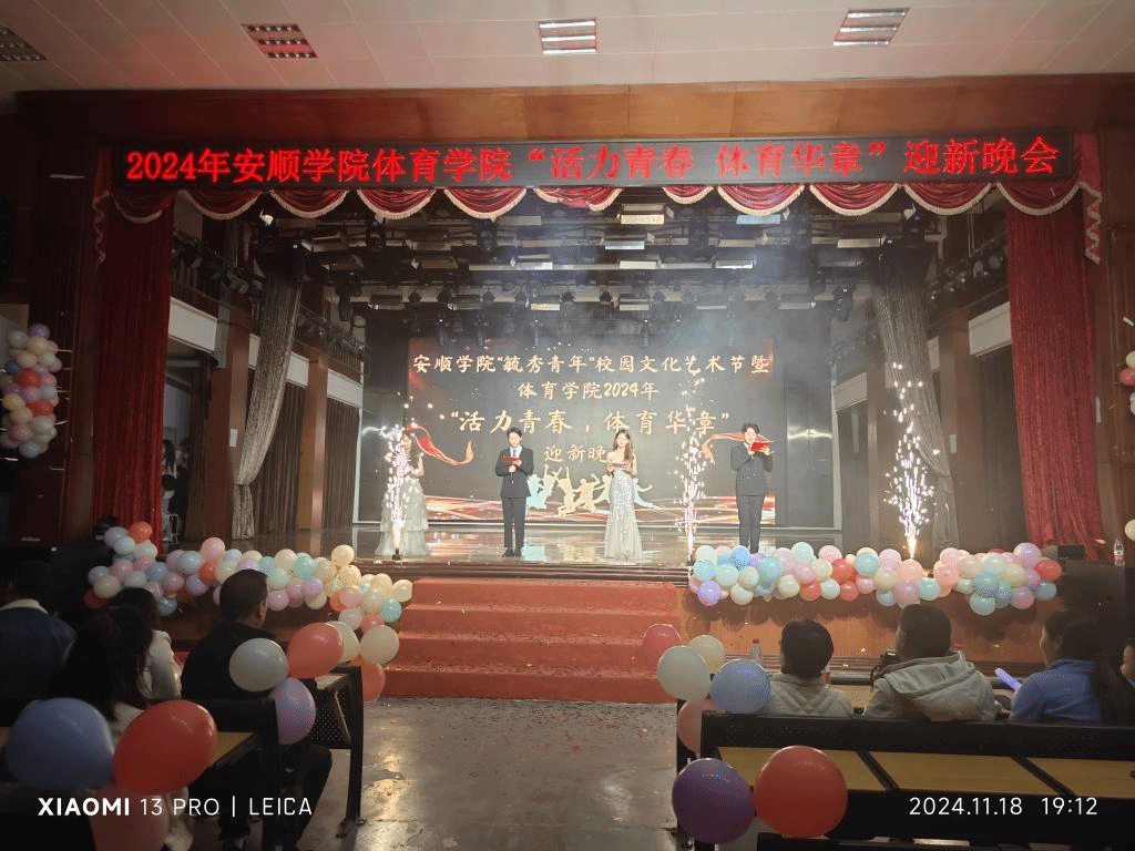 2024年11月18日,体育学院在大礼堂举行“活力青春,体育华章”主题迎新晚会。体育学院党委书记孙黔、大学公共体育教学部副主任刘宁、副院长雷蕾、团总支书记田宇、专职辅导员李磊和全体学生及各学院学生代表参加晚会。
