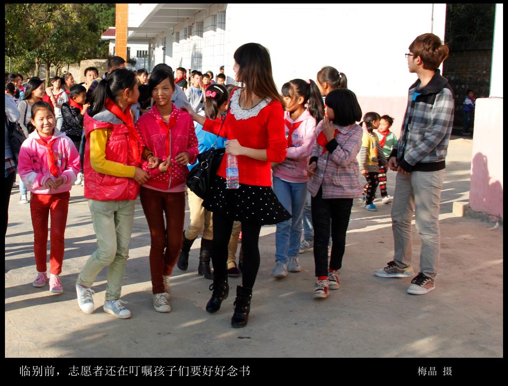 时间很快到我们离开的时候,学生纷纷要求与我们合影留念。一个孩子拉着志愿者的手抽泣地说:“老师,你别走,今天在这里,明天再去。”此刻,一切喧嚣化为宁静,一切凡尘化为晶莹的泪水。我们强忍着眼泪安慰着抽泣的男孩。最后,他含着泪向我们挥挥手,还边哭边喊着:“老师,你什么时候再来?记得一定要给我们打电话啊!”电视里的剧情展现在我们眼前,内心无法平息的激动让我们沉默。看着车窗外远去的孩子、教学楼、山坡,一切都开始模糊,此时我们又在想象下次相见的场景,并期待着下一次的快点到来。