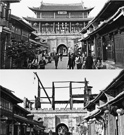 云南巍山古城拱辰楼火灾前后对比图。新华社记者 蔺以光摄