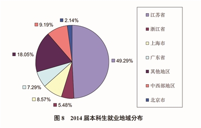东南大学将毕业生的就业地域划分为江苏省、上海市、广东省、浙江省、北京市、中西部地区、其他地区。本科生49.29%留在江苏就业,18.05%的毕业生选择去浙江省,2.14%北上前往北京工作,8.57%去了上海。值得注意的是有9.19%的毕业生“投身”中西部地区。河海大学2014届本科毕业生就业区域主要分布在华东、华北、华南、华中地区。其中华东地区占68.17%,华北占8.07%,华南占6.45%,华中占5.03%。