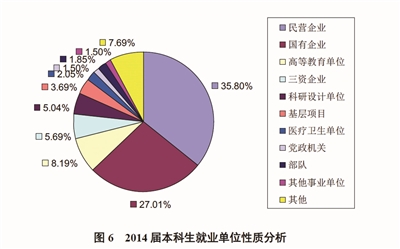 东南大学本科生主要就业单位性质为民营企业和国有企业,所占比例分别为35.80%和27.01%;党政机关、部队、事业单位就业人数则相对较少。