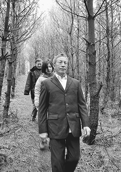 文朝荣(前一)走在亲手种出的树林中。(资料图片)