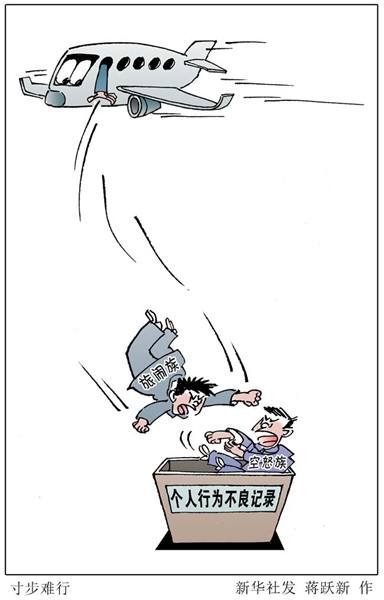 乘客“大闹亚航”、擅自打开飞机应急舱门,类似事件接连发生后,国家旅游局、中国民航局表示,要把“旅闹族”“空怒族”纳入个人行为不良记录。让任性的“飞闹”寸步难行,一定要有制度,使不良行为有记录可查。 新华社发 蒋跃新 作