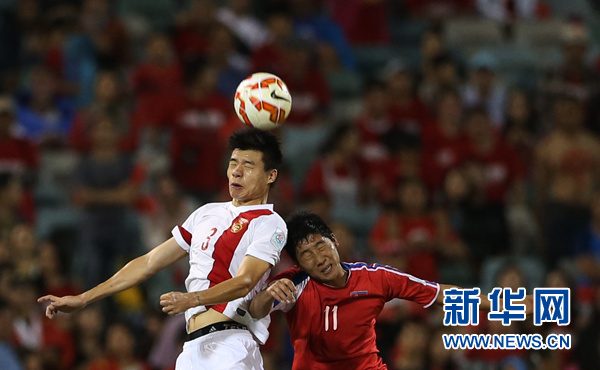 1月18日,中国队球员梅方(左)与朝鲜队球员郑日冠在比赛中争顶。(新华社记者 曹灿 摄)