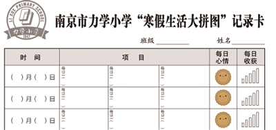 学唱一首歌、跳一会绳、做一道聪明题,这可以是一个小学生寒假一天的所有作业,而寒假里每一天的作业都可以根据孩子们的心情不停变幻。寒假临近,不少小学的寒假作业单已经新鲜出炉。记者在采访中发现,南京力学小学就新推了一种“拼图式”的新型寒假作业,让孩子们根据兴趣每日选择三项活动内容,DIY自己的寒假生活,而“寒假作业记录卡”中不仅要记录每日的活动选项,还要自评心情,非常的萌萌哒。详细>>>