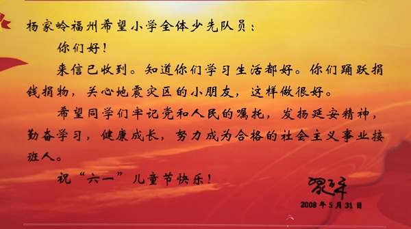 2008年,时任国家副主席的习近平又一次写信寄语杨家岭福州希望小学的同学们。