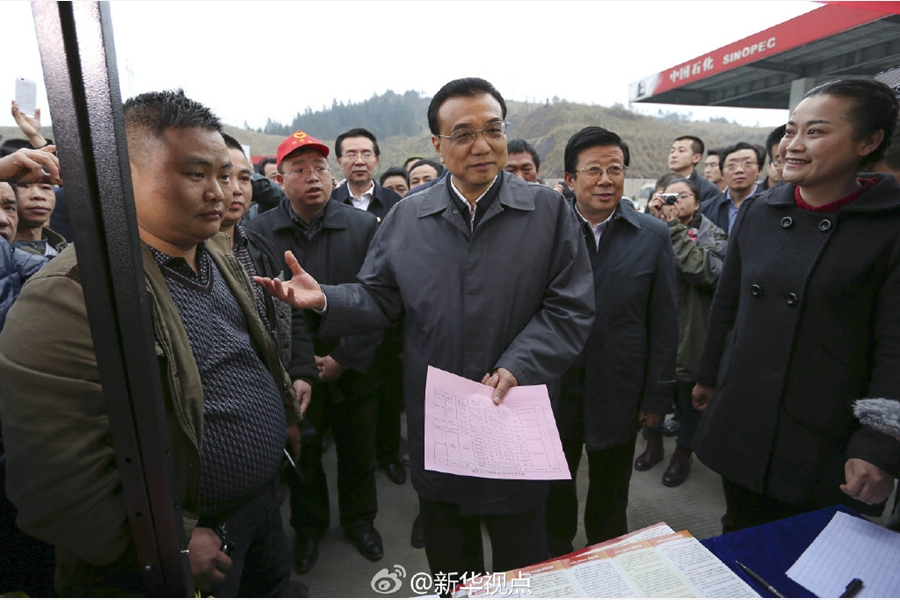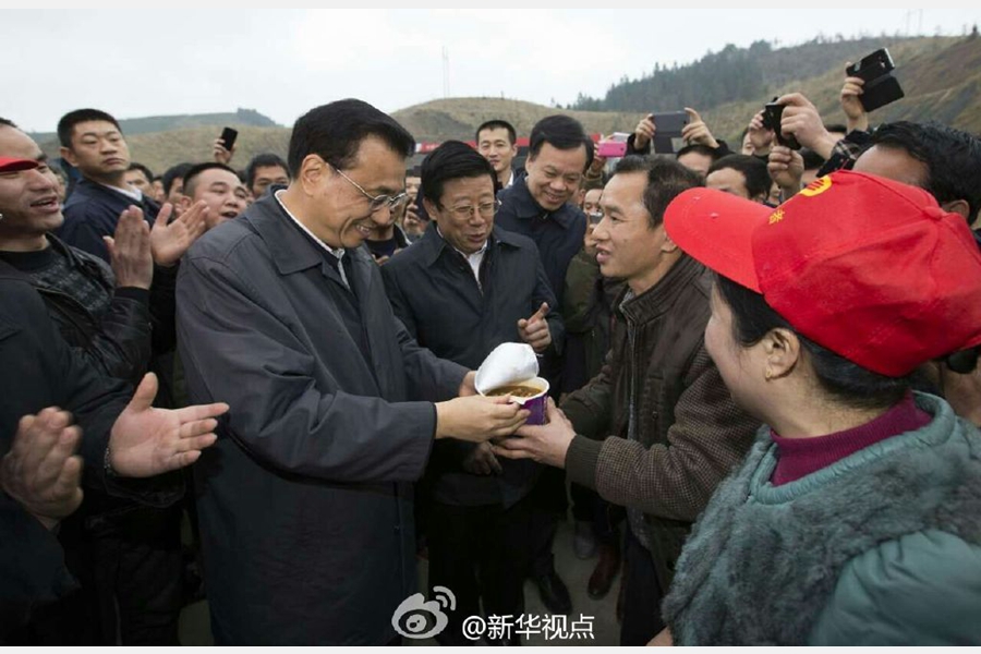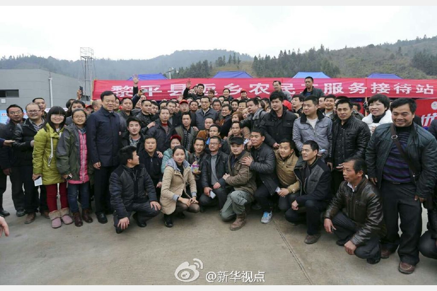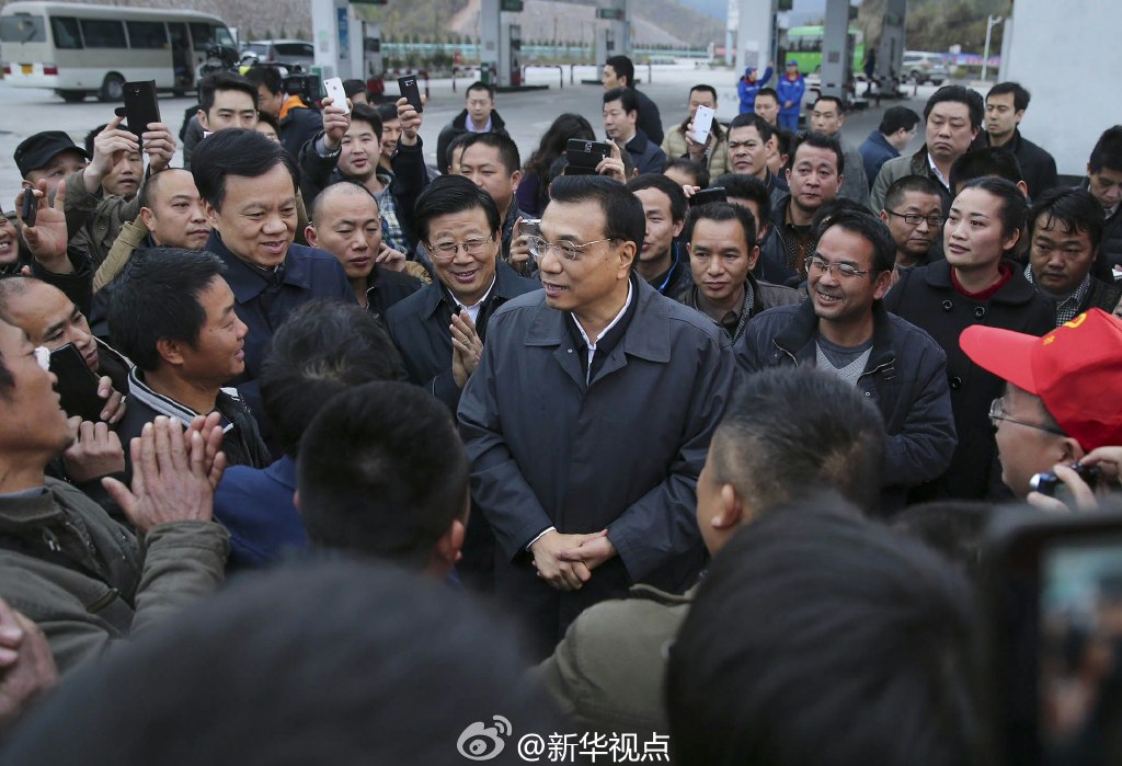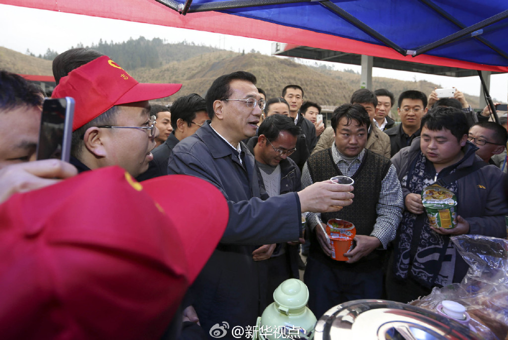 新华网北京2月15日电 据新华社“新华视点”微博报道,贵州黎洛高速中潮服务区农民工服务站,为返乡农民工免费提供茶水、泡面及法律咨询、用工信息等服务。李克强总理14日专程到此看望正在歇脚的农民工。他说,服务站不仅代表政府给进城务工人员返乡提供服务,更给他们人文关怀、人性照顾,让他们“暖身暖心”。