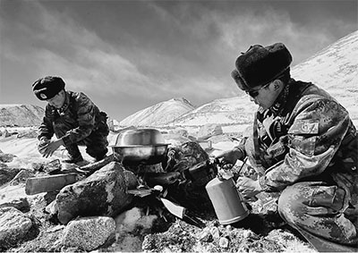 大年三十,西藏阿里高原气温骤降至零下21摄氏度,位于喜马拉雅山脉腹地的扎西岗边防连,按计划对海拔5580米的绒隆山口执行巡逻任务。图为边防连士官次仁顿珠(右)、王俊融雪烧水为巡逻分队准备午餐。 向文军摄(新华社发)