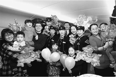 大年三十,坚守在工作岗位上的郑州客运段高铁一队G567次列车乘务人员,与旅客一起迎接羊年的到来。记者 史家民摄