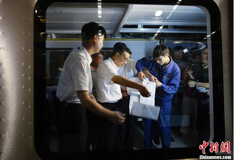 李克强总理2014年7月4日在南车集团考察,登上机车装配生产线,察看监控仪表并体验座椅。李克强说,中国装备走出去,你们的机车车辆是代表作。我每次出访都要推销你们的产品,你们要备加爱惜自己的声誉。中国装备的生命在于质量,这是我们获得全球认可的根本保证。 中新社记者 刘震 摄