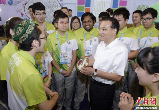 8月28日,中共中央政治局常委、国务院总理李克强在南京出席第二届夏季青年奥林匹克运动会闭幕式之际,代表党中央、国务院专程看望青奥会志愿者代表,向2万多名中外志愿者表示亲切慰问。中新社发 刘震 摄