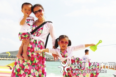 贵阳年轻妈妈吴群带着一双儿女在海边度假。